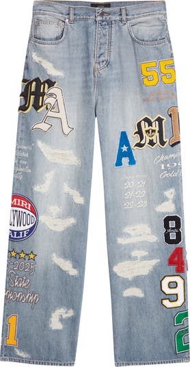 Think yearbook energy with a nightlife rewrite: bold collegiate patches, high-contrast numbers and a light wash that’s been properly roughed up. From the label’s pre-spring ’26 collection comes these jeans made in Italy from rigid denim that's been dashed and thrashed for maximum grit.