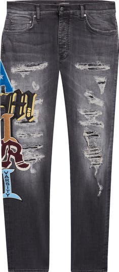 Prominent logo patches add varsity-inspired style to skinny jeans cut from faded stretch denim that's been ripped and repaired for a timeworn look.