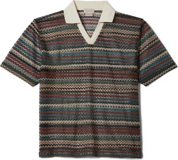 An open johnny collar furthers the relaxed stance of this cool polo made from open-stitching in a retro stripe design.