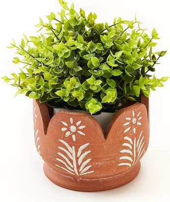 Keep plant friends happy in our sturdy and versatile handcrafted Vasanta terracotta planter with hand painted accents and drainage hole. Artisans use traditional pottery making techniques to make planters in modern designs. Display and care for houseplants, succulents, herbs indoors or as part of your gardening routine for garden plants and flowers. The neutral look of terracotta lends itself well to various indoor and outdoor environments, in a home, on a patio or balcony. Planters and plant pots make great gender neutral gifts for him or gifts for her for housewarmings or for any other special occasion for someone who appreciates greenery and the energy of plants around them. Shop the entire Vasanta Collection to display together.