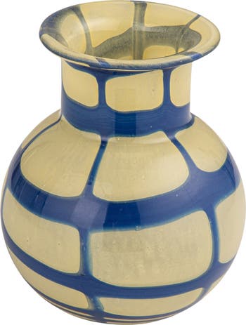 This Glass Vase with an intricate design in a soothing cream and blue color palette perfectly blends elegance and functionality. Its detailed design and harmonious colors make it a captivating addition to any room, effortlessly enhancing Art Deco, Scandinavian, Coastal, and Garden decor styles. Ideal for showcasing fresh blooms or dried arrangements or as a decorative standalone piece, this vase is crafted from durable glass that is both durable and easy to clean. It measures 6.25 inches in diameter and 7.25 inches in height, making it a versatile and stylish choice for any home. Whether displayed on a mantel, shelf, or dining table, this glass vase will be a stunning focal point in your home.
