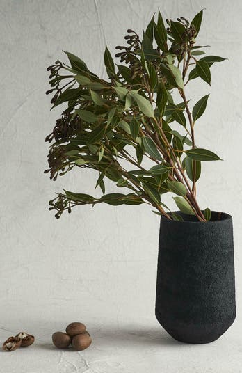Thick, sand-cast aluminum forms are finished in a heavy, ash black textured coating, giving them a lava-like appearance. This simple tall vase adds sculptural beauty to the room, even when standing empty.