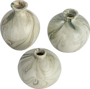 This set of three round stoneware vases with a green marbled design is a must-have for home decor enthusiasts. The vases have a unique pattern resembling natural marble, creating a striking contrast against a white background. Available in three sizes, they can be filled with fresh or dried flowers, branches, or grasses, adding a touch of nature and elegance to any space. Made of durable stoneware, these vases are durable, easy to clean, and have a smooth glazed finish. Place it on tables, shelves, mantels, or windowsills, and create a cozy and inviating atmosphere. They make a great gift for those who appreciate farmhouse, garden, botanical, or coastal beach style.