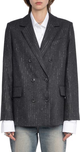 This rock-'n'-roll-infused blazer goes beyond the traditional 9-to-5 tailored in a relaxed, double-breasted silhouette that's streaked with metallic threads for shooting-star shimmer.