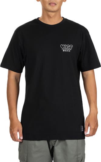 Spray-paint logo art tags the front and back of a T-shirt designed for making your own mark in the comfort of soft, breathable cotton.