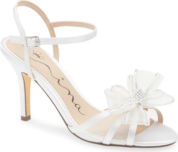 A rhinestone-trimmed bow adds glamorous volume to the mesh upper of an occasion-ready sandal secured with an adjustable strap at the ankle.