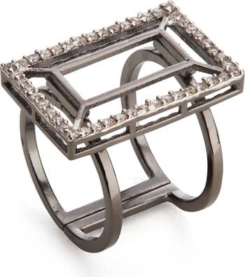 The Vazio Ring is handcrafted in black rhodium-plated brass and set with white cubic zirconia. Its adjustable design allows for a comfortable fit, while the geometric motif and dark plating create a bold, contemporary statement.