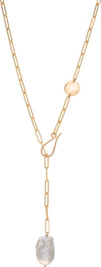 Veda Baroque Pearl Lariat in 14k gold-filled, featuring a hammered disc and Baroque pearl. Hand-forged and adjustable for versatile, modern elegance.