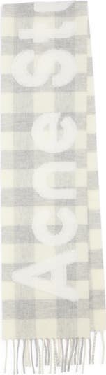 A statement-scale logo lives large across this boldly checked fringe scarf made from a warm wool blend.