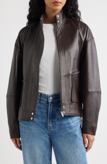Supple leather brings rich texture to this cool-weather-essential jacket topped with a posh stand collar and popped with edgy zip pockets.