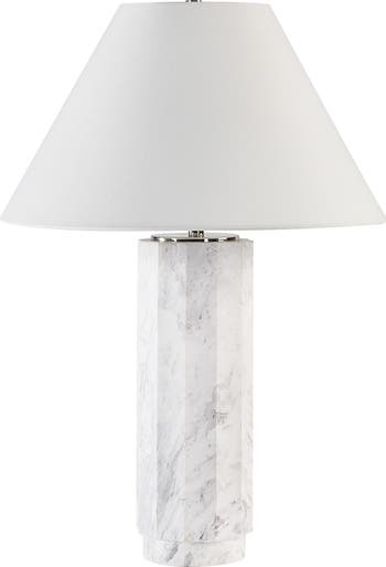 An elegant addition to your décor, this dimmable table lamp is crafted from Volakas marble and paired with an ivory shade that creates a warm glow.