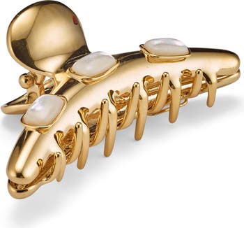 Mother-of-pearl accents and a golden finish add rich color to this claw clip that securely keeps your updo in place.