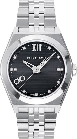 A striped guilloche dial with twelve diamond hour markers enhances the sophisticated style of this handsome and precise timepiece.