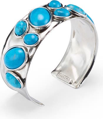 This bold bracelet features scattered reconstituted-turquoise stones set along a sculptural rhodium-plated cuff, creating a striking balance of color and shine. Designed with a flexible closure for an easy fit, it’s a modern statement piece in one of the season’s most sought-after shades.