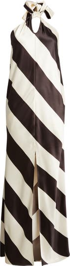 A striking take on occasion dressing, this satin halter maxi dress stands out in bold diagonal stripes that elongate the silhouette. The keyhole neckline and tie-back halter add a touch of drama, while the open back keeps the look sleek and alluring.