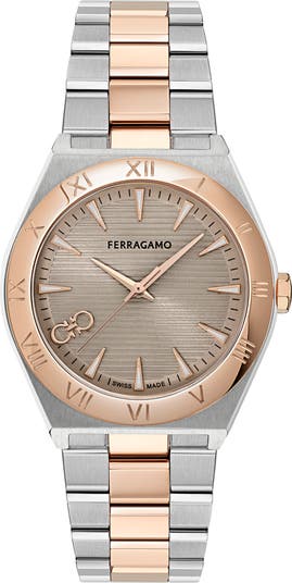 A striped-guilloche dial with a double-Gancio logo adds Ferragamo's sophisticated DNA to this poised and precise timepiece highlighted by rose gold plating. Made with pairing potential, this men's style has a twinned women's style (sold separately).