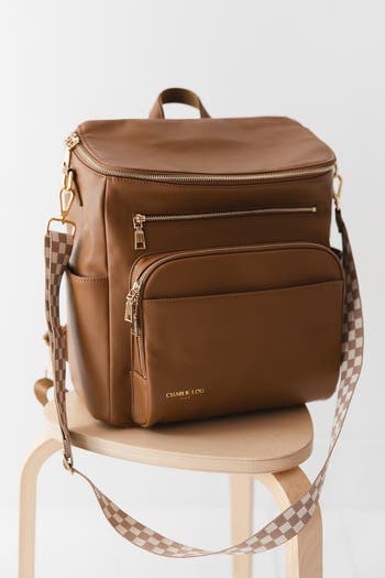 A diaper bag that actually looks good. Made from durable vegan leather and packed with smart features—this bag keeps you organized without sacrificing style. It includes two insulated bottle pockets inside, tons of zippered compartments, and both backpack and crossbody straps (with a trendy checkered design you’ll love). It even comes with a changing pad and stroller straps for life on the go. Bonus: feet at the base keep it standing tall, not slouching over. Material: PU Leather Features: Insulated bottle holders, crossbody & backpack straps, stroller holders, changing pad, metal feet, multiple pockets Size: Height 14" x Length 13" x Width 7"