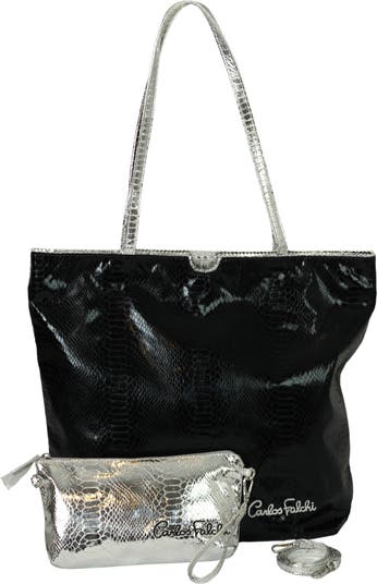 Experience the iconic design of the Carlos Falchi Vegan Python Tote. Offering a luxurious and conscious choice, this generously sized tote is meticulously handcrafted with 100% vegan materials and features a realistic python texture. Its spacious interior is designed for the modern lifestyle, easily accommodating all work and daily essentials. Adding extreme versatility, the set includes a detachable 3-in-1 pouch that can be used as a crossbody, an elegant wristlet, or securely attached inside the main tote.