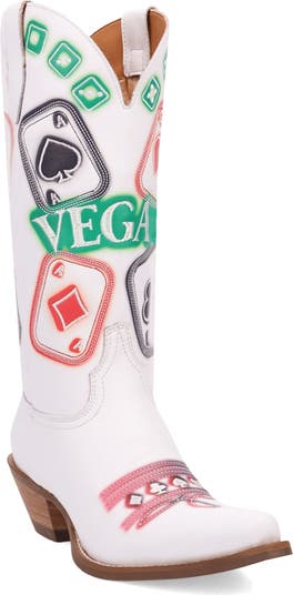 Bright lights and casino-floor glamour inspire these Vegas-style Western boots designed with embroidered playing cards and dice motifs set on a low block heel.