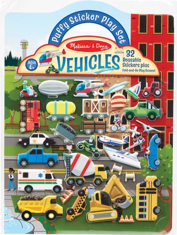 Your kiddo will have tons of fun learning about the different types of transportation vehicles with this set filled with 32 puffy reusable stickers they can affix to the included fold-and-go play scenes.