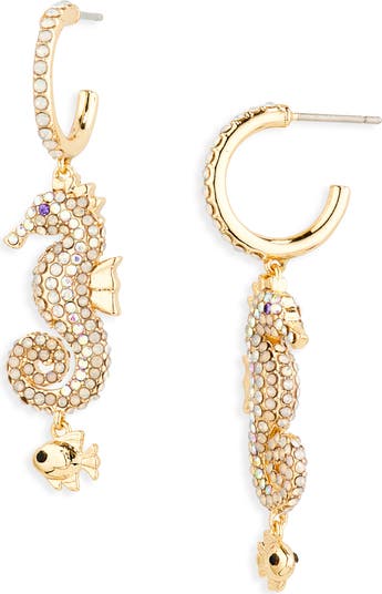 A golden shine and twinkling crystals illuminate these seahorse drop earrings that bring ocean-inspired charm to your look.
