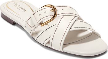 A polished buckle and contrast topstitching bring depth and dimension to crisscrossing leather straps on a slide sandal complete with signature comfort cushioning.