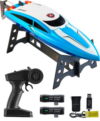 HIGH SPEED REMOTE CONTROLLED BOAT: The Force1 Velocity boat toy is a fast RC boat for adults and kids that races across pools and lakes. This rc speed boat has super cool features like underwater driving, low battery alert, and auto capsize recovery! Includes a 2.4GHz remote control transmitter with 100-meter signal range, 2 rechargeable boat batteries, and USB charger. RC BOAT FOR ADULTS AND KIDS: This remote controlled boat features low battery alarm, easy controls, a double-hatch body for control over waves, capsize recovery mode to turn the boat upright if flipped, and high capacity battery for longer run time UNDERWATER DIVING AND DRIVING: Dive below the surface with this speedy mini rc boat! Its unique underwater driving feature allows for thrilling dives and aquatic adventures, bringing a whole new dimension to RC boating. Dive, drive, and discover the depths like never before! ADVANCED REMOTE CONTROL: Smart 2.4 GHZ boat remote control with dive button/power LED/trim adjustment/Left-Right direction/forward-reverse throttle, and low signal warning to avoid the boat going out of range (up to 328 feet) and the ability to race multiple boats at once! RECHARGEABLE RC BOAT: 10.85” Remote control speedboat includes (2) rechargeable 3.7 V 800mAh Lithium-Ion toy boat batteries, spanner, boat stand, remote control (requires 3 x AA size batteries - not included). Charge time 120 mins for 12 min play, for ages 8 and up DURABLE FRESHWATER BOATS: Race these durable remote control boats in rivers and lakes with low surface-debris or use as a pool boat in outdoor/indoor pools with liners; these boats are NOT for saltwater use SAFE AND SUITABLE FOR ALL AGES: Designed with user-friendly features and built-in safeguards, the Force1 Velocity Blue is the perfect gift for both kids and adults, ensuring a memorable and secure RC boating experience