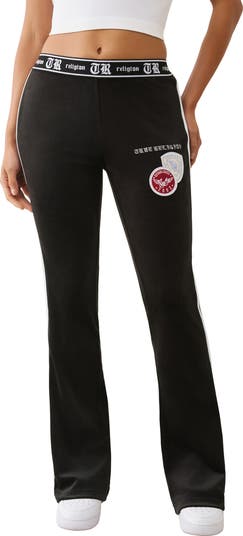These track pants go full Y2K rewind with stretchy velour that hugs then fans into a subtle flare. The elastic waist circles in repeating logos and the thigh fires three big logos for pocket-size billboard energy.