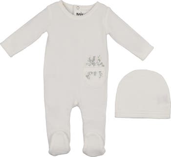 Plush velour surrounds your little one with cozy comfort in a soft footie featuring a sweetly embroidered pocket and matching beanie to give baby extra coverage.