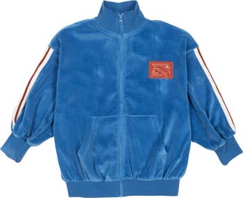 Our Velour Track Jacket in Blue Note has raglan sleeves and kangaroo pockets. This retro style features front patch logo design and a big apple inspired back graphic.