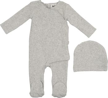 A matching hat lends extra coverage to this supersoft velour footie sweetened with scalloped trim.