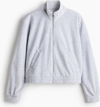 Short, loose-fit jacket in soft velour with a stand collar, zip down the front and diagonal welt pockets at the front. Smocked elastication at the cuffs and hem.