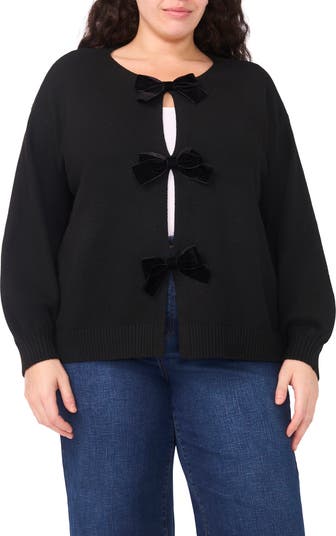 A trio of plush velvet bows elevates a roomy cardigan fixed with blouson sleeves.