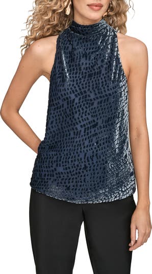 Tonal texture adds a plush pop to a cowl-necked tank that works as a striking solo player or a low-profile first layer.