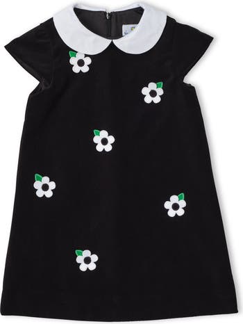 A holiday classic with a touch of whimsy, this dress is crafted from rich black velvet and finished with a crisp white satin collar for timeless elegance. Appliqué flowers bloom across the bodice, adding playful detail to a polished silhouette. The above-the-knee length keeps the look festive yet comfortable, while a back zipper ensures easy dressing. Perfect for family portraits, holiday gatherings, and special celebrations, this dress blends heirloom quality with cheerful charm. Black velvet, 100% polyester, white satin, satin collar, appliqué flowers, back zipper, above-knee length.