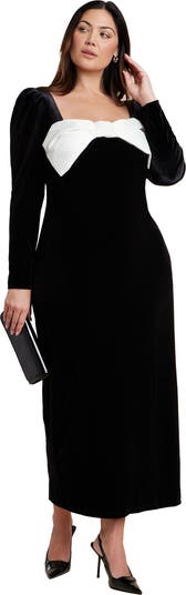 Step into elegance with this stretch-velvet maxi dress finished with a satin bow front-and-center. Long sleeves and a sweetheart neckline bring romantic refinement to every occasion.