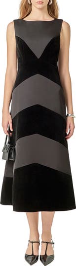 Smooth satin and plush velvet create a distinctive stripe pattern on this occasion-ready A-line dress.