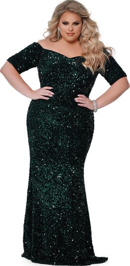 Velvet Sequin Short Sleeve Plus Size Evening Gown