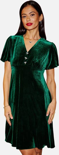Turn up the glamour this party season in gorgeous luxurious velvet. This skater style is perfect for the festive season, with cute puff sleeves and diamante bow details adorning the bodice. An easy and relaxed fit for everyone.