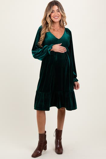 Embrace timeless elegance with our Velvet Smocked Maternity Long Sleeve Dress. Crafted from ultra-soft stretch velvet, this dress features a beautifully smocked bodice offering a flattering fit for every trimester. The sophisticated hue and luxurious feel make it a stunning choice for holiday gatherings, maternity photoshoots, or special occasions. Designed with comfort in mind, the flexible waistband and flowy skirt gently accommodate your growing bump. Dress it up with heels or keep it casual with flats—this versatile piece is a must-have for your maternity wardrobe!