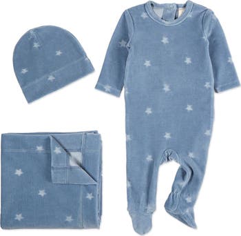 Infant skin is incredibly delicate. That's why we recommend this star-spangled 3-piece footie set for baby boys ages 0 to 6 months. All 3 pieces come in plush velour -- cotton-rich for cozy comfort; gently brushed for velvety softness. There's even a smidge of spandex for flexible custom fit. Perfect baby shower gift.