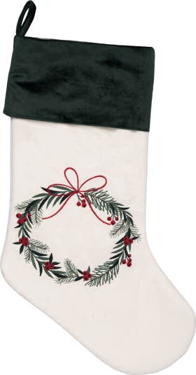 Elevate any holiday decor with the exquisite embroidered and embellished Velvet Wreath Stocking. This stunning stocking features a luxurious deep forest velvet cuff that beautifully contrasts with the soft white body. Adorned with an intricately embroidered wreath of delicate green pine tree needles and vibrant berries, it exudes a festive charm. The embroidered wreath is topped with a graceful flourishing red bow, adding a pop of color and elegance to any mantle. Perfect for filling with treats and gifts, this beautifully crafted stocking is sure to become a cherished part of holiday traditions for years to come.