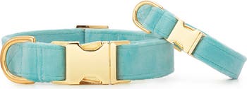 A soft velveteen design with glinting hardware defines a plush and comfortable collar that adjusts to perfectly fit your pup.