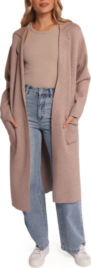 Extra length and notched lapels give an open-front cardigan coat-like appeal.