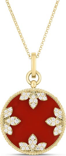 A red-agate inlay features twinkling diamonds in leaf-inspired settings on this striking pendant necklace that is inspired by Venetian medallions.