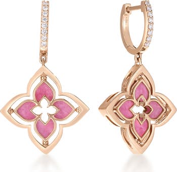 Flower-inspired charms gracefully pivot between rosy rhodonite and pavé diamonds to ensure these 18-karat-gold earrings always shine.