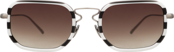 Venetian sunglasses feature a distinct geometric frame with a stylish black and white striped pattern and brown gradient lenses, perfect for a modern look.