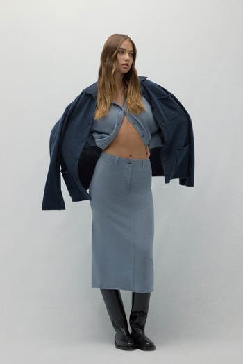 A wardrobe classic redefined—the denim midi skirt, reimagined in fine Italian cashmere. Made in Italy, it blends casual ease with indulgent luxury.
