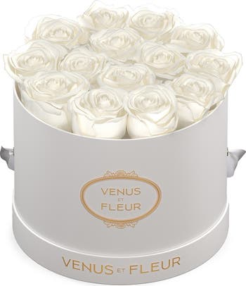 This arrangement features stunning Eternity Roses® set in a hat box-inspired round box. It is an ideal arrangement for elevating any small space and serves as a perfect gift. An Eternity Rose is a luxury rose that can last more than a year with proper care.