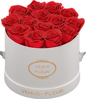 This arrangement features stunning Eternity Roses® set in a hat box-inspired round box. It is an ideal arrangement for elevating any small space and serves as a perfect gift. An Eternity Rose is a luxury rose that can last more than a year with proper care.